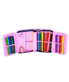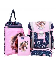 Štiridelni set vključuje šolsko torbo, vrečko za copate, polno 28 delno peresnico in prazno peresnico, ki zagotavljajo dovolj prostora in organizacije za shranjevanje vseh šolskih potrebščin. Ergonomsko oblikovano hrbtišče in oblazinjene ter nastavljive naramnice zagotavljajo udobje pri nošenju.