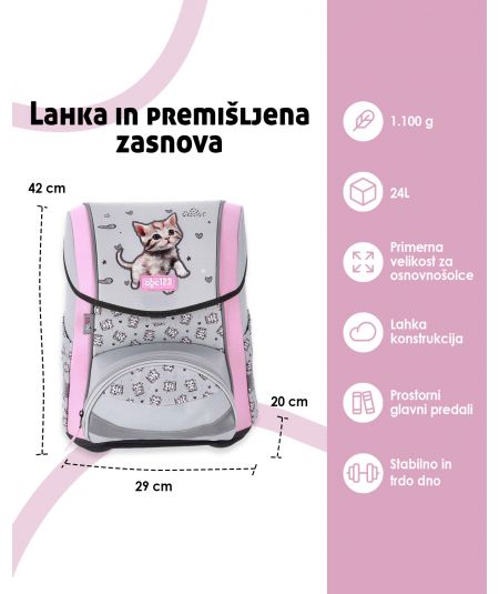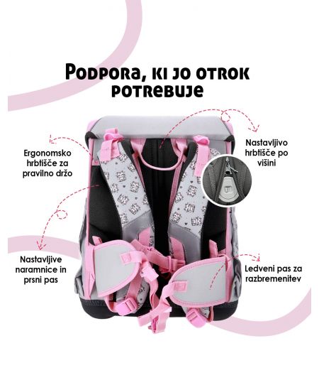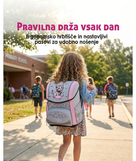 Šolski nahrbtnik za osnovnošolce, ki potrebujejo udobje in pravilno oporo. Ergonomsko hrbtišče pomaga pri drži, nastavljivo hrbtišče pa se prilagodi rasti. Primeren je za vsak dan v šoli. V setu dobite vse, kar otrok potrebuje.